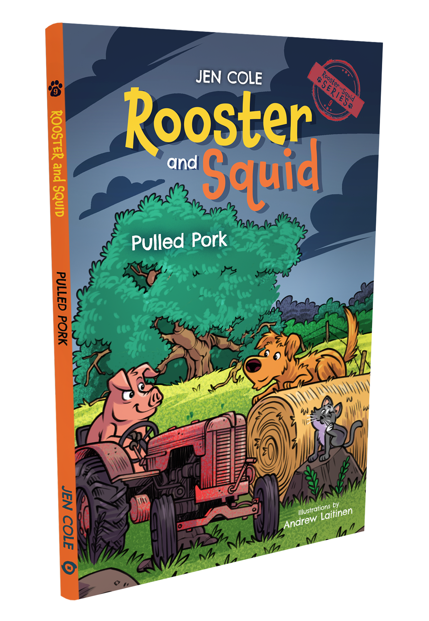 In the ninth book in the Rooster and Squid series, Pulled Pork, Rooster, Squid, and the family spend a long weekend visiting Aunt Toots and Uncle Trumpet on the Farting Filly Farm, which is famous for two things — Clydesdale horses and beans! Between a monster rainstorm, a loose tooth, and a motley crew of animals, the weekend turns into a topsy-turvy tale of a tractor rescue.