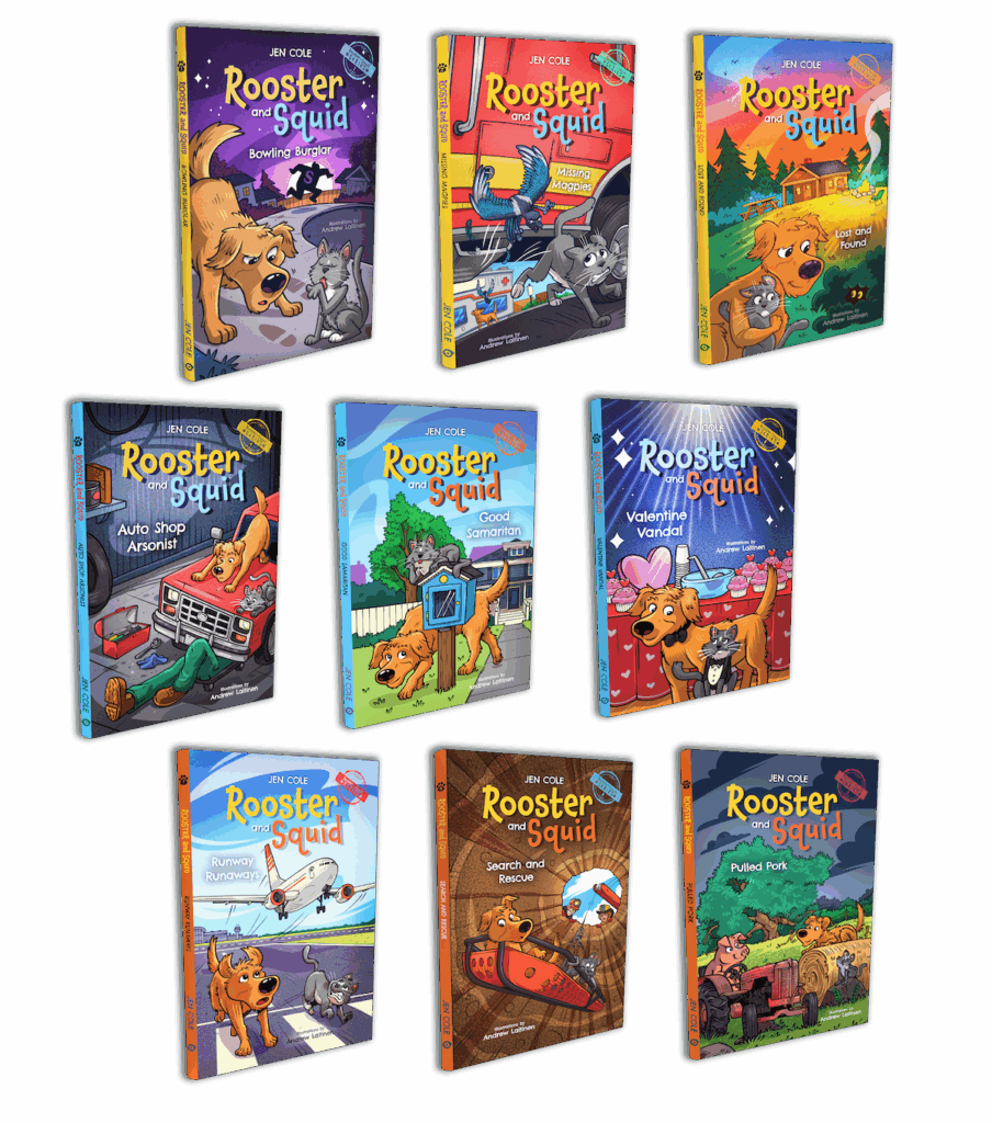 Rooster, a handsome Golden Retriever who loves belly rubs and bacon, and Squid, a mangy grey cat who loves big naps and butt scratches, are an unlikely duo. Even though their early days were spent scrounging for food and seeking shelter, they knew they were meant for more. As luck would have it, they were rescued by the town veterinarian and welcomed into the best family ever.