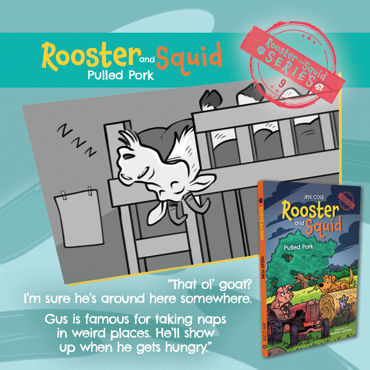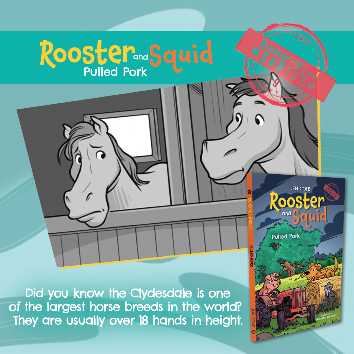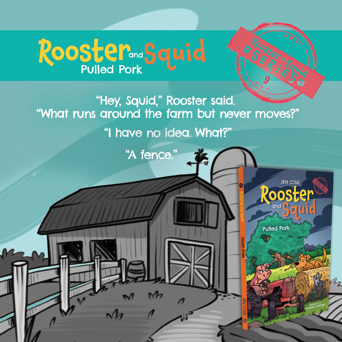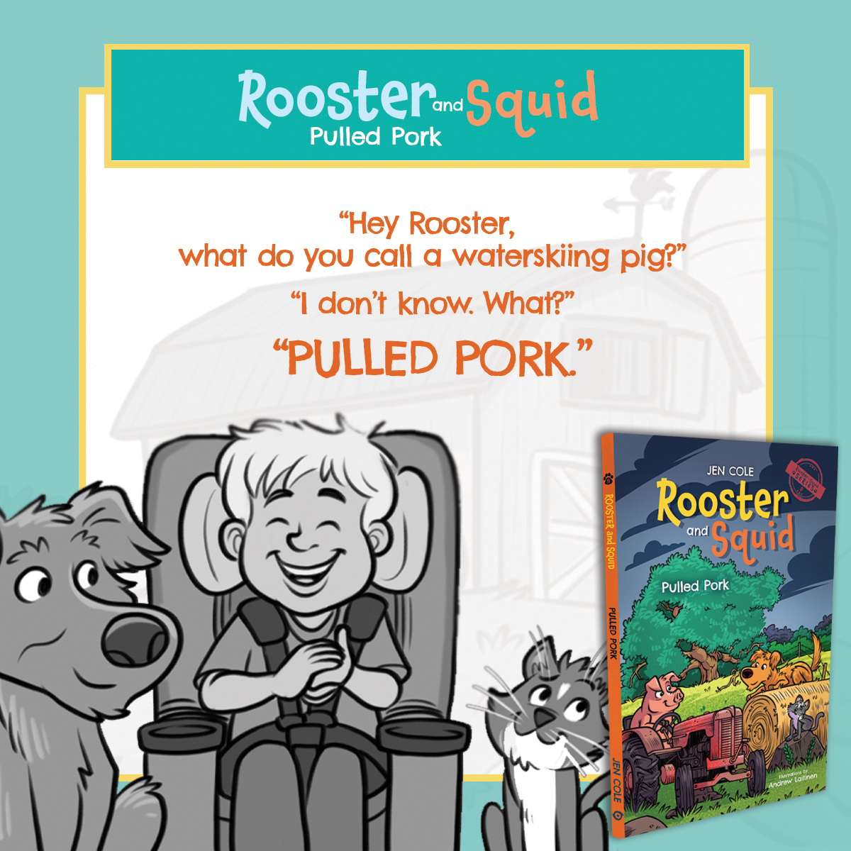 In the ninth book in the Rooster and Squid series, Pulled Pork, Rooster, Squid, and the family spend a long weekend visiting Aunt Toots and Uncle Trumpet on the Farting Filly Farm, which is famous for two things — Clydesdale horses and beans! Between a monster rainstorm, a loose tooth, and a motley crew of animals, the weekend turns into a topsy-turvy tale of a tractor rescue.